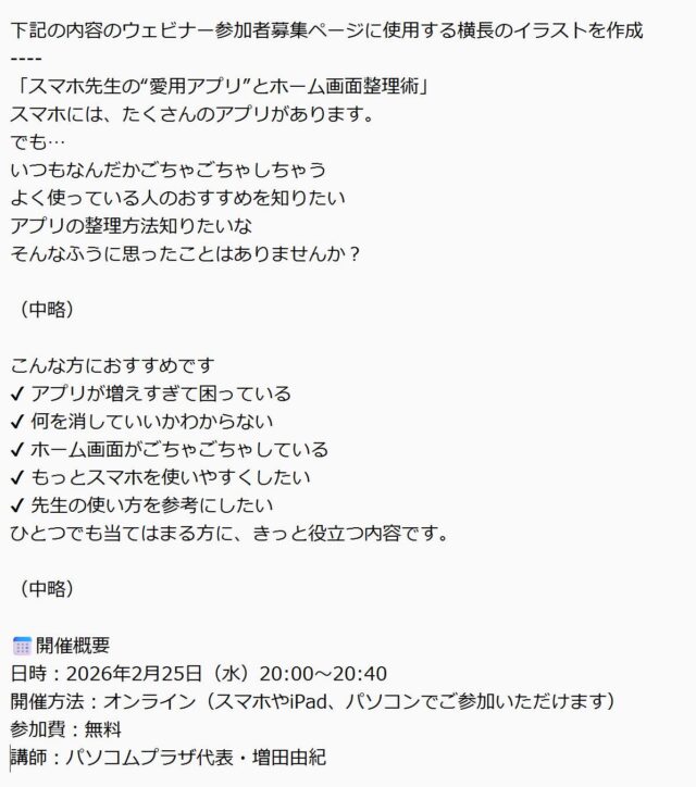 ウェビナーの告知ページも概要を送れば、あっという間にきれいなレイアウトで仕上げてくれるので、もやもやっとした画像生成中の画面から、ぱっとイラストが出てくれば「ほんとすごい!!」と思います。