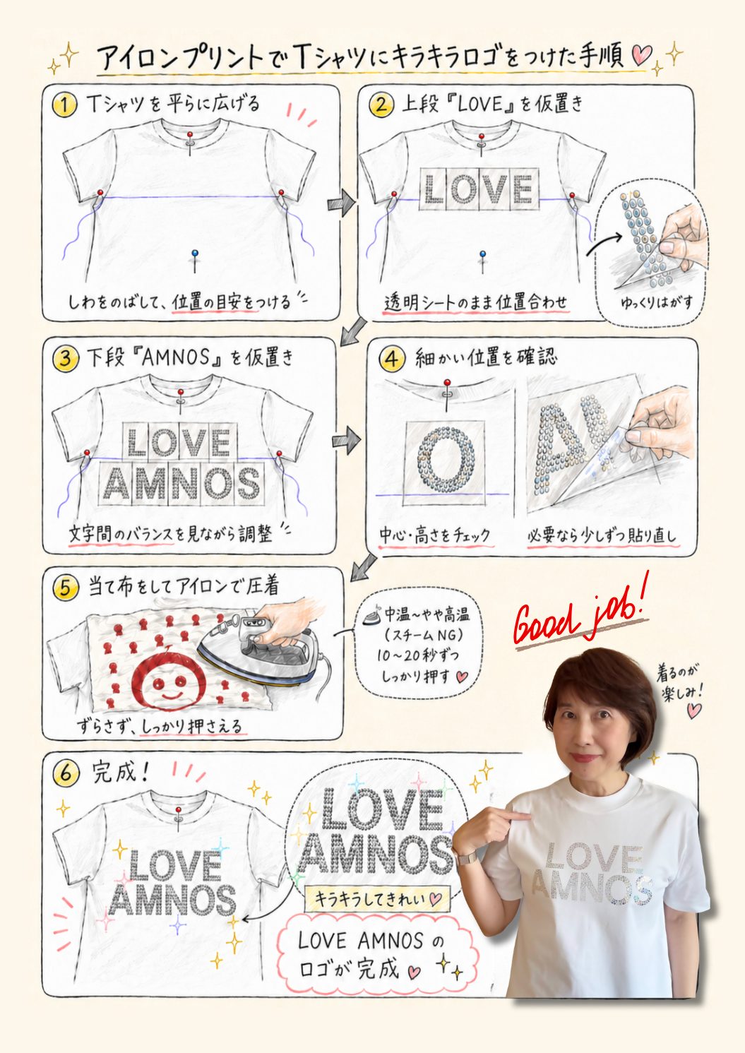 アイロンプリントでTシャツにキラキラロゴをプリントした手順を、手書きスケッチ風にまとめて
