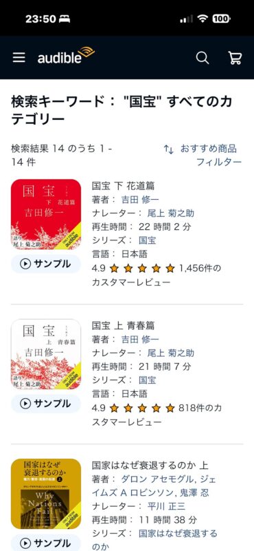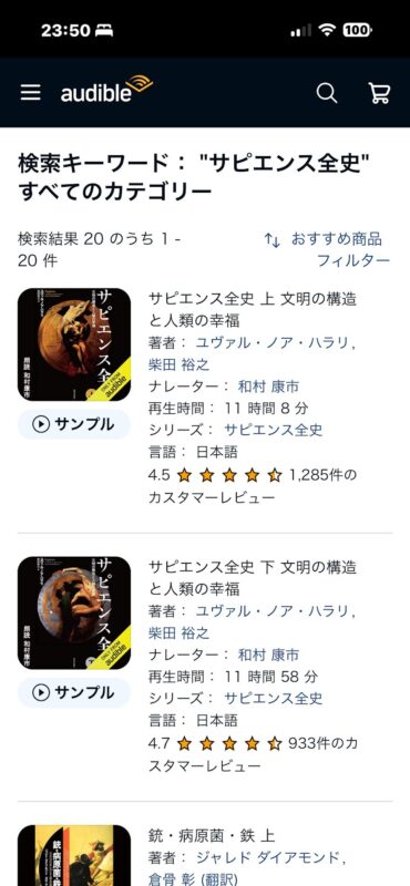 次に、大作です。一度読んでみようと思って断念した「サピエンス全史」です。再生時間11時間です。全部聞いたら11時間8分。