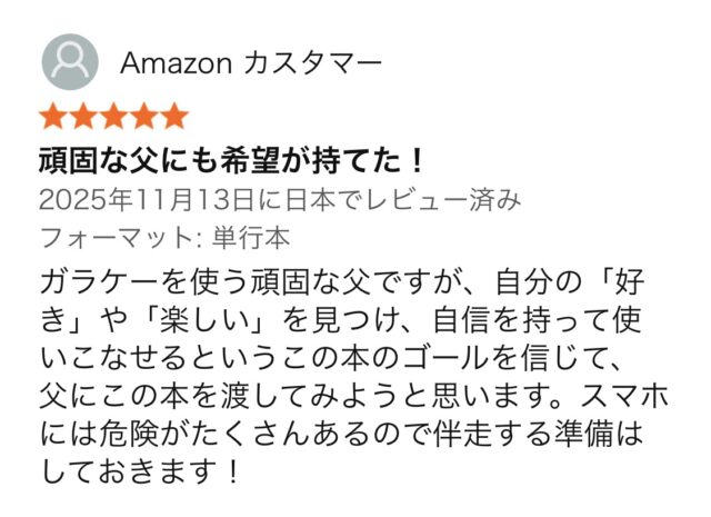 本のタイトルの通り、親御さん世代に寄り添う気持ちで読んでくださった方がレビューを寄せてくださって、本当にありがたい限りです。