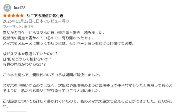 こちらはお母様へ。親にスマホをもっと使ってもらうために購入、まさにタイトルの通りですね。