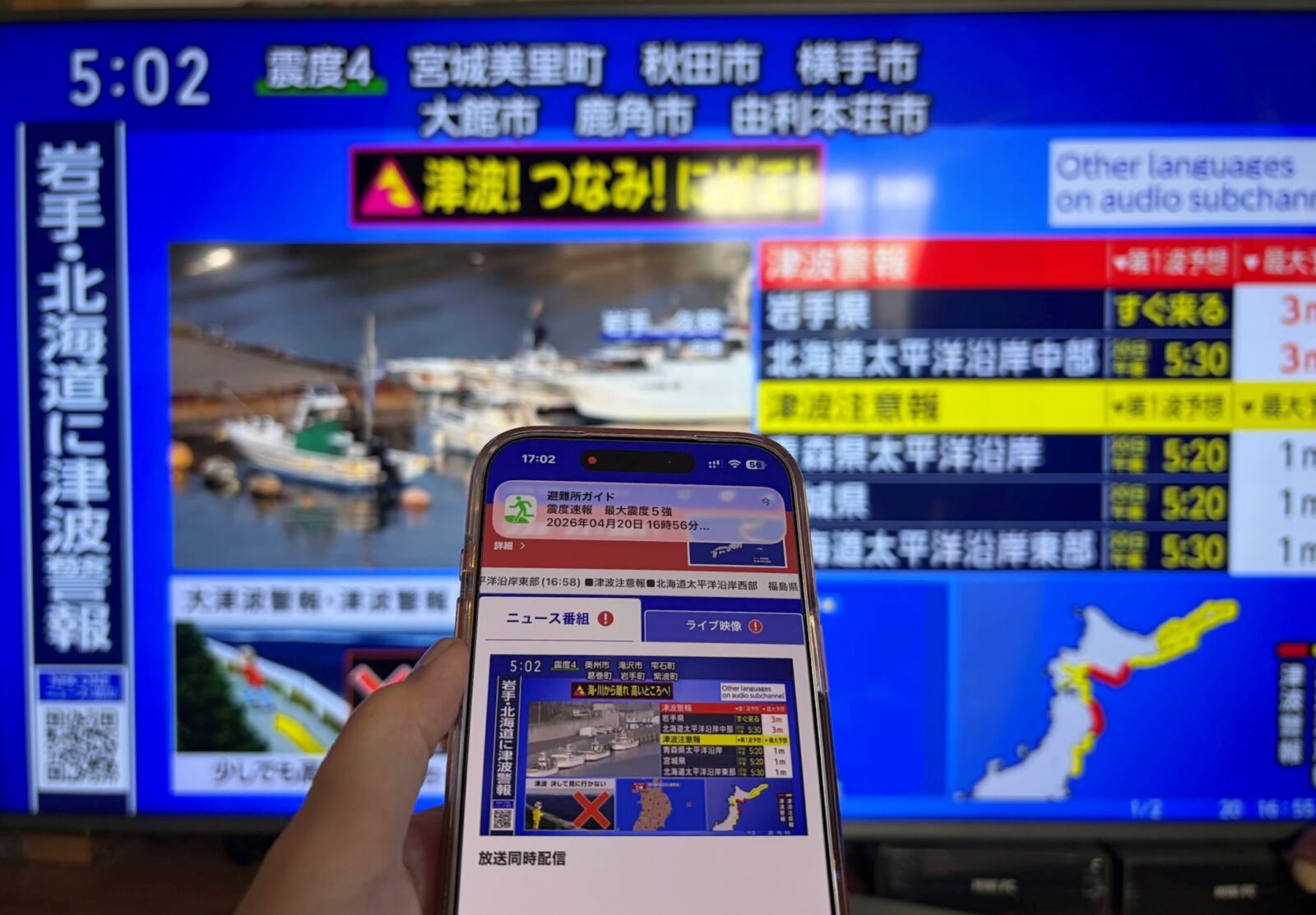 テレビと iPhone を並べて津波警報を視聴