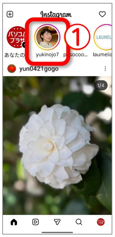 そこに「yukinojo7」が出てきます。期間中は投稿をし続けていますので、インスタグラムを開いた上のところに、毎日「yukinojo7」が表示されるはずです。見つからない時は画面の上を「左に、左に」と動かしてみてください。