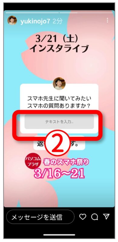2)yukinojo7をタップしていただくと、ストーリーの投稿(縦長の画像や動画)が見られます。その中に「スマホの質問ありますか?」という投稿が出てくるはずです。