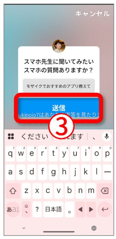 3)するとキーボードが表示されて、質問を書きこめるようになっています。書いたら【送信】です。