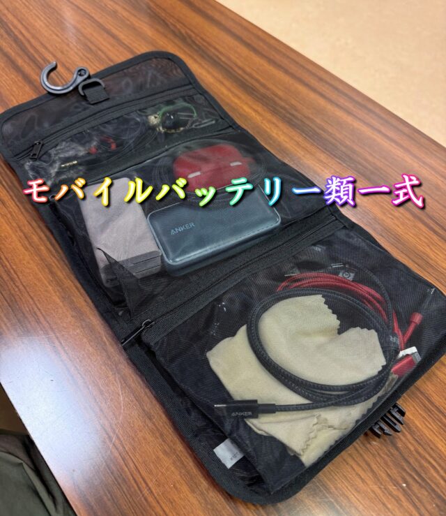 それからケーブル類。ケーブルがないと充電できないので、この辺りは致し方ない荷物です。