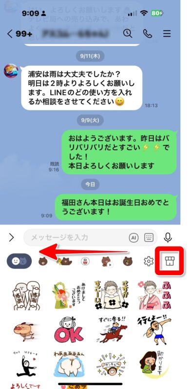 スタンプを送る画面で、スタンプ一覧の画面を左に動かすと、スタンプショップのアイコンが表示されます。これをタップ。