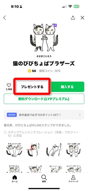 可愛いのを見つけたら【プレゼントする】をタップすます。いいのを見つけたけどどうしようかな、と思ったら❤を押しておくという手もあります。