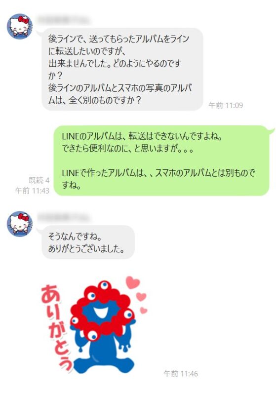 LINEを使っている人は多いので、こうしたご希望が多ければもしかしたら今後、LINEの機能につくかもしれませんが、今は「アルバムの転送はできない」が答えです。