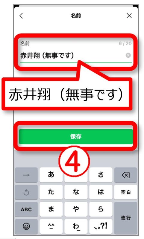 ③【名前】をタップし、20文字まで入力して【保存】をタップ。