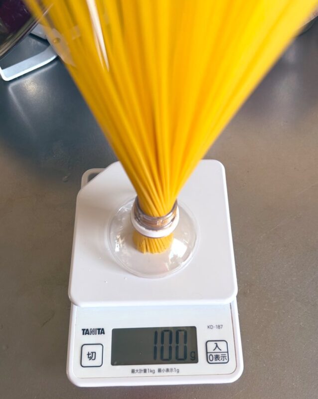 ペットボトルの上だけ切って、そこにパスタをピッタリ入れてみたらほんとに100gでした。