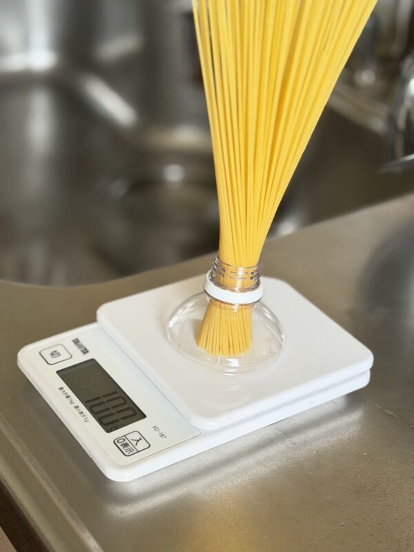親指と人差し指で輪を作って、適当にパスタを握って、それで1人前を測るのですが、何しろ目分量なもので「多すぎた」「ちょっと足りなかった」ということがよくあります。