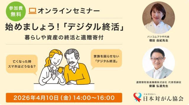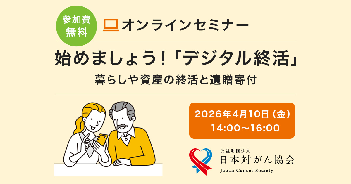 日本対がん協会は、2026年4月10日(金)に、終活セミナー「始めましょう!『デジタル終活』 暮らしや資産の終