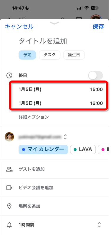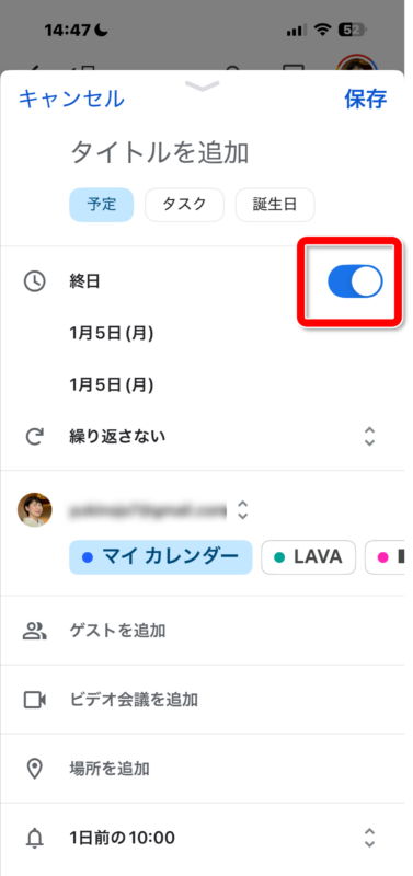 時間は決まっていないけれど「この日」という場合は、【終日】をオンにします。