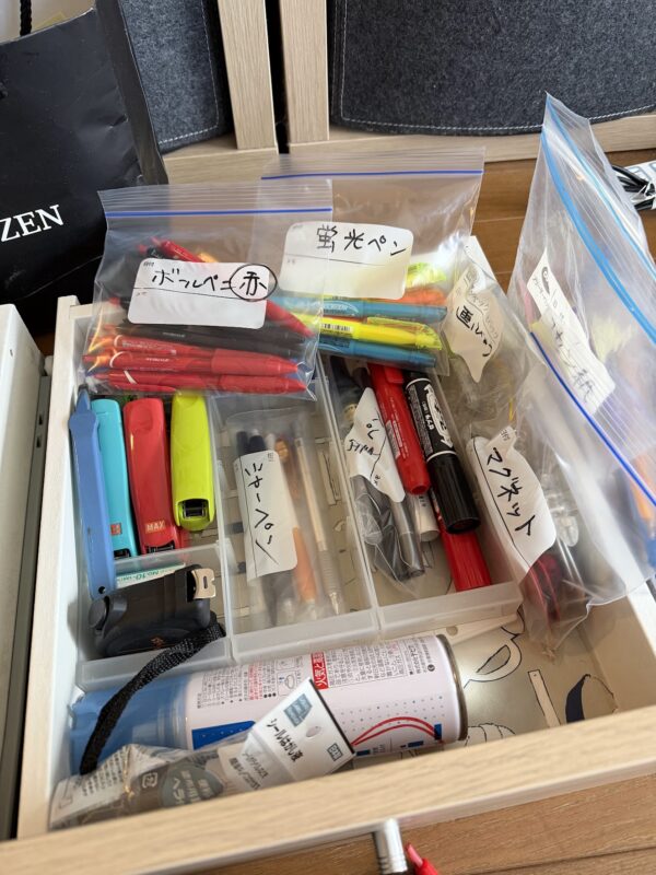 こまごまとしたものが多い文房具なので、袋に分類して整理しています。