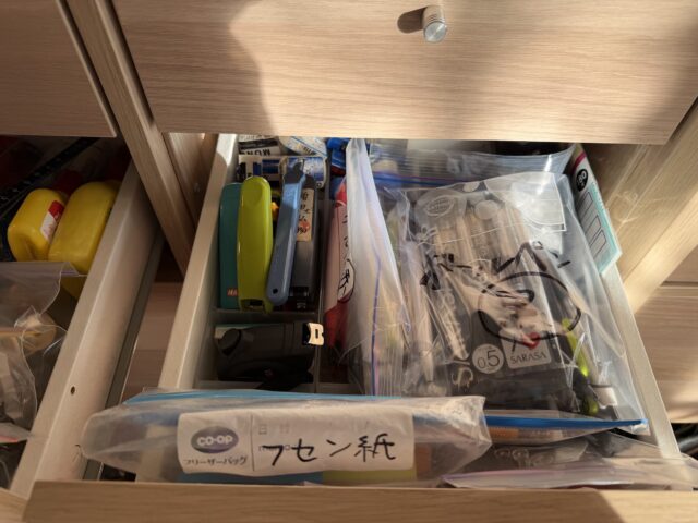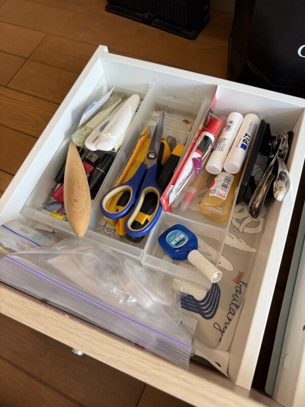 文房具の引き出しは2つですが、我が家では「はさみはどこだ」「マーカーはどこ?」「のりは?」と、私が聞かれることが断然多い(笑)。