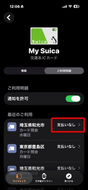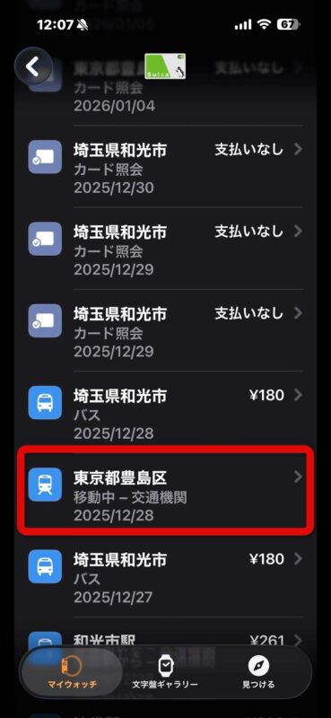 つまり、Apple Watchで改札をタッチして改札は通ったけれど、「改札を出た」という記録がないのです。