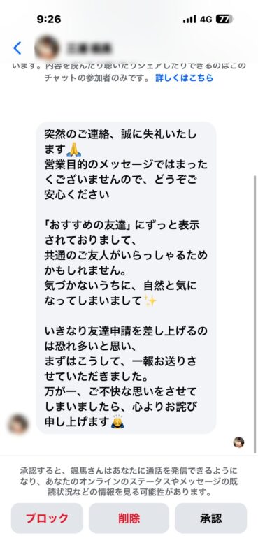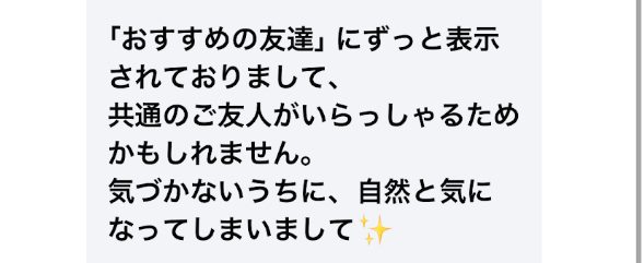 と書かれたメッセージは、よく来るんです。調べてみると、確かに「共通の知り合い」がいたりします。でもなんとなく怪しさを感じて、「私の知り合い、本当にこんな人と友だちかなあ?」と思ってしまうんですよね。