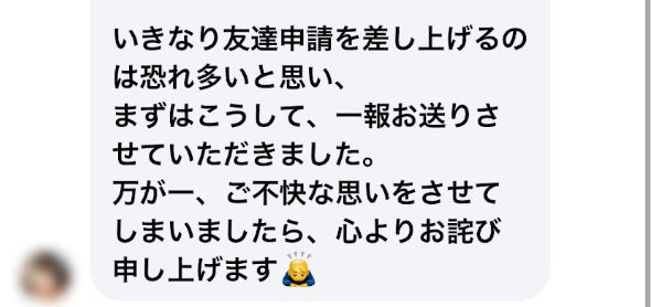 いきなり友達申請を差し上げるのは恐れ多いと思い、まずはこうして、一報お送りさせていただきました。(※一部抜粋)