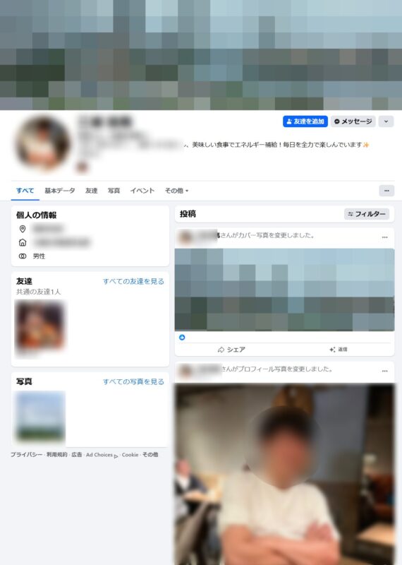 もちろん全部がそうだとは言い切れませんが、投稿が全然ないこの人。一体Facebookどうやって使っているんだろう? そんな人がいきなりメッセンジャーで「共通の友人が」とか言ってくる? そもそもSNSを日常遣いしてないし。