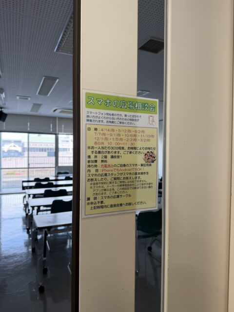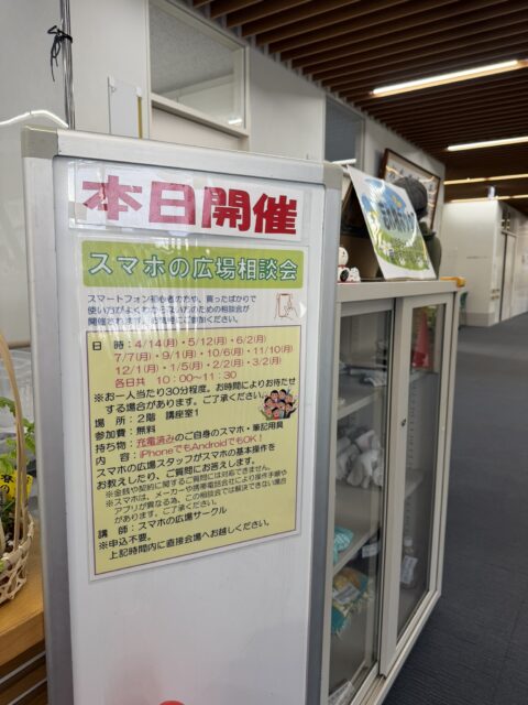 受付には告知の張り紙が。「本日開催」スマホの広場相談会です。
