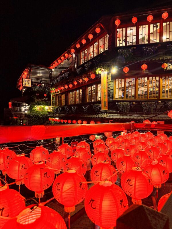 夜の街、ランタンが赤く印象的ですね。