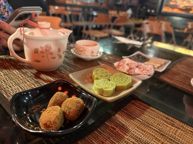 茶芸館でお茶を飲みながら、積もる話をいろいろと。