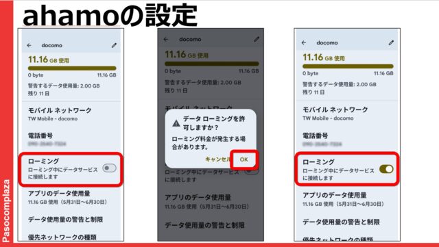 それからAndroidはahamoの契約をしてあるので、【ローミング】のスイッチをオンにすれば、現地の電波を拾います。簡単ですね。