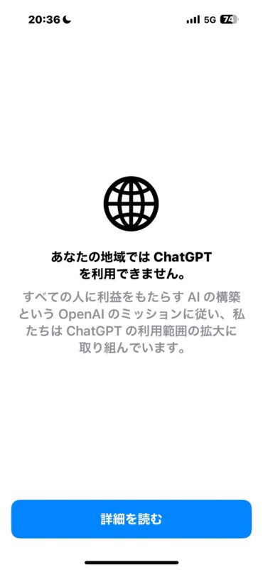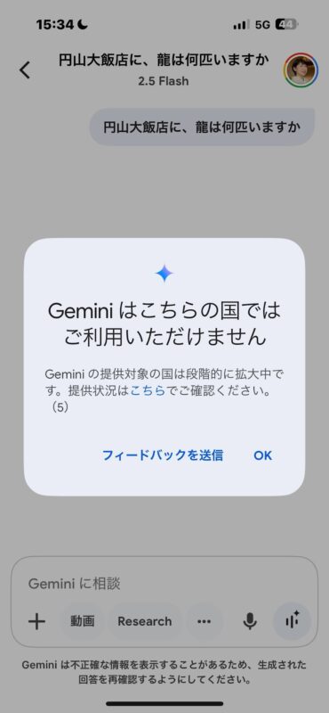 eSIMもahamoも、通信に問題はなかったので非常に快適でしたが、eSIMの契約があまりに安すぎたのが災いしたのか、屋外でChatGPTとGeminiを使おうとするとこんなメッセージが。