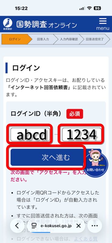すると、用紙に記載されているログインIDとパスワードがもう入力された状態で表示されました。うまくできていますね。【次へすすむ】をタップします。